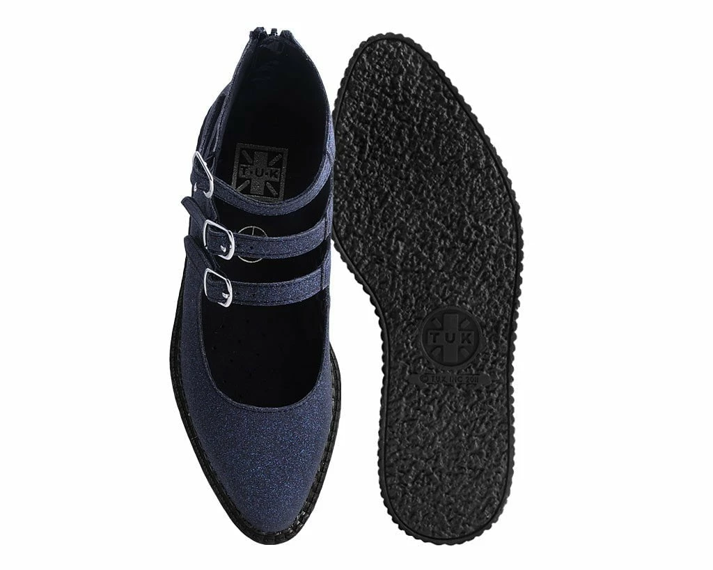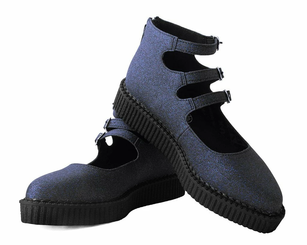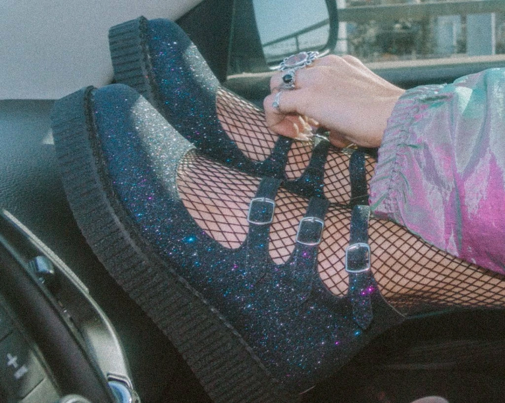 Slip on style. Features a black glitter, pointed-shaped toe and multi-strap closure for an adjustable fit. Sits on top of a low sole creeper platform that measures 1 ΒΌβ at the heel and ΒΎβ in the front. Has a back zipper for easy on/off wear and removable memory foam padding for added comfort.