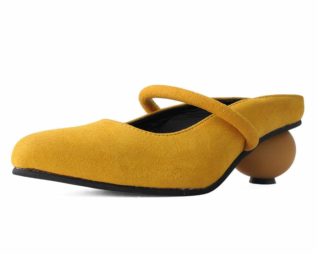 These slip-on heels feature a funky ball heel shape. Has a vegan-friendly upper made of mustard yellow faux suede. The ball heel height stands at 2” tall.