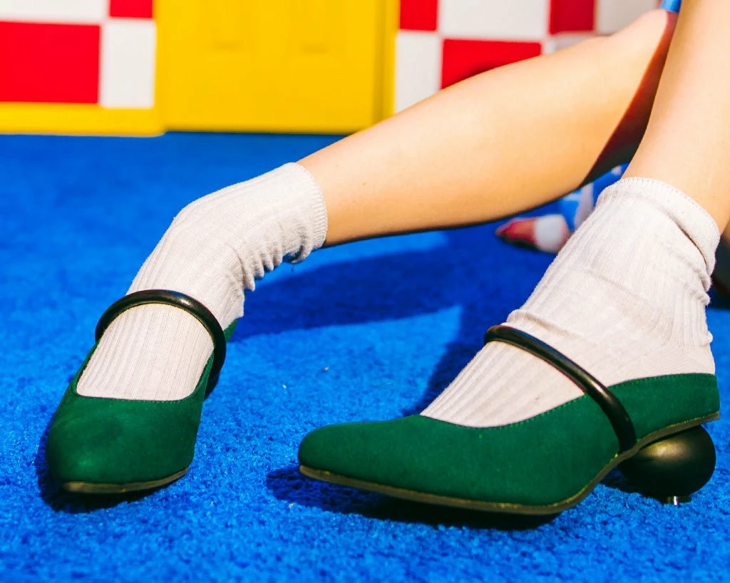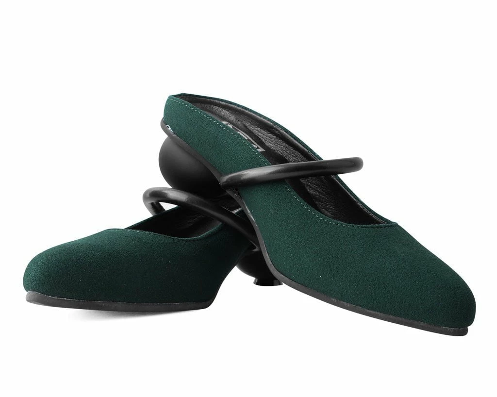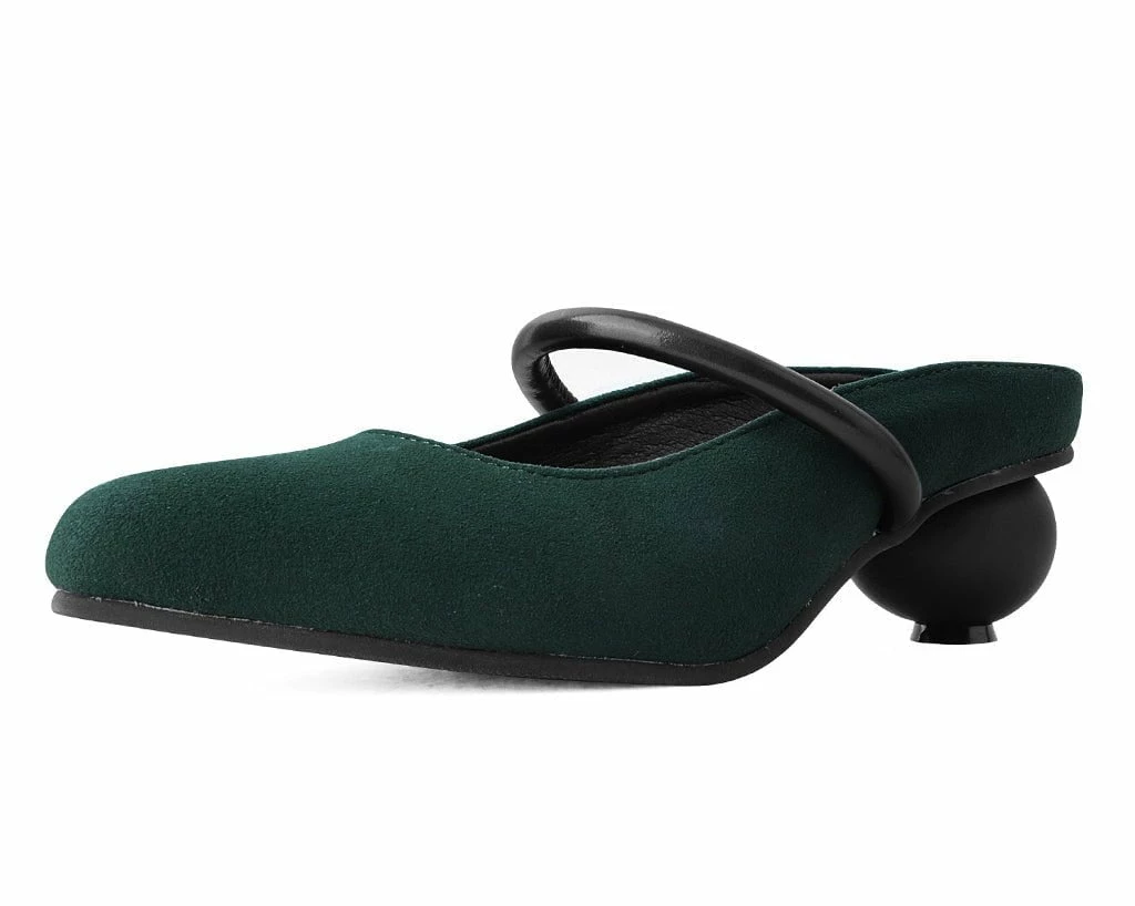 These slip-on heels feature a funky ball heel shape. Has a vegan-friendly upper made of cedar green faux suede. The ball heel height stands at 2β tall.