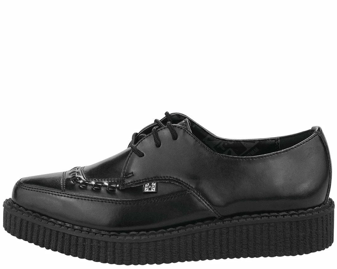 Step out in style with the newest addition to the T.U.K. family — our black leather lace up pointed creepers! Perfect for dressing up these shoes feature black leather throughout, black lace detail, pointed toe. Creeper sole measures approximately 1.25 inches.