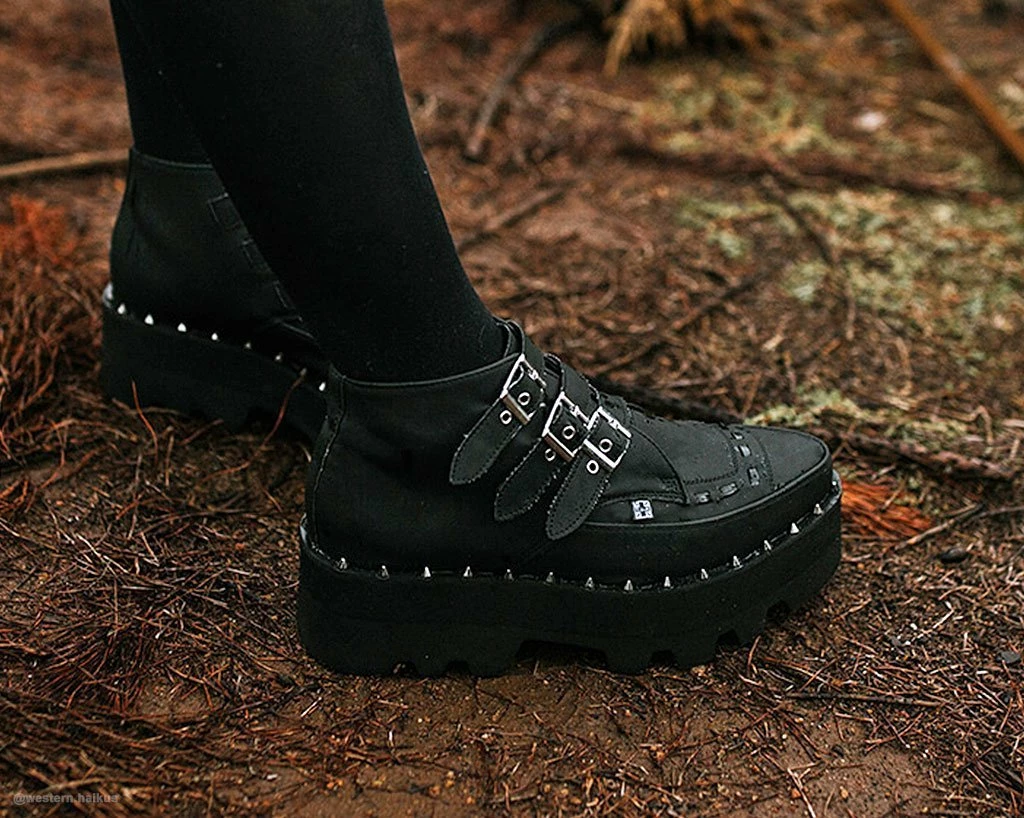 Talk about such great heights. Amp up your shoe game with these creeper boots featuring a cool, dino lug platform sole. Features a vegan friendly black matte faux leather upper and is lined with small silver spike studs for an extra finishing touch. Has a sole height that is approximately 2 ΒΌβ at the heel and 1 7/8β in the front. Has removable memory foam padding for added comfort.