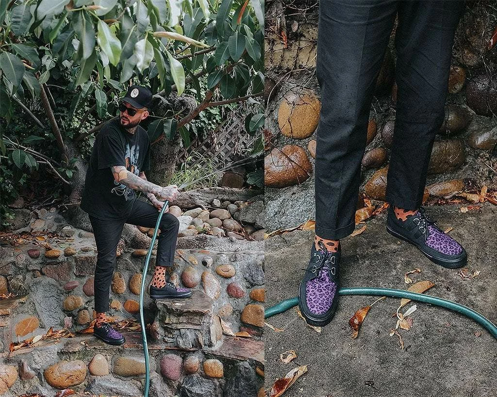 Rock your style in these timeless creeper sneakers. Get ready to hit the stage or the streets in these vulcanized sneakers that re-imagines our former creeper sneaker silhouette with bold & modern twists. Features a vegan black twill upper & purple leopard faux fur with classic D-rings iconic interlace detailing along the front. The fun animal print gives an extra dose of rock n’ roll that looks great on guys & girls alike!