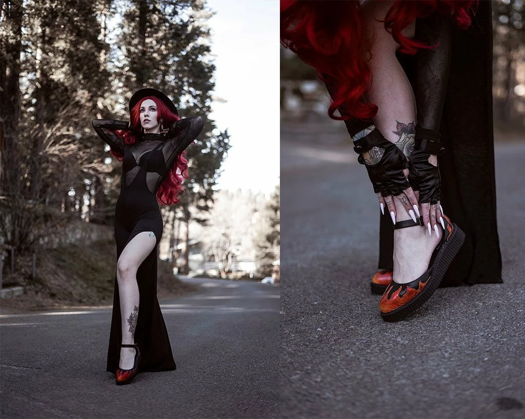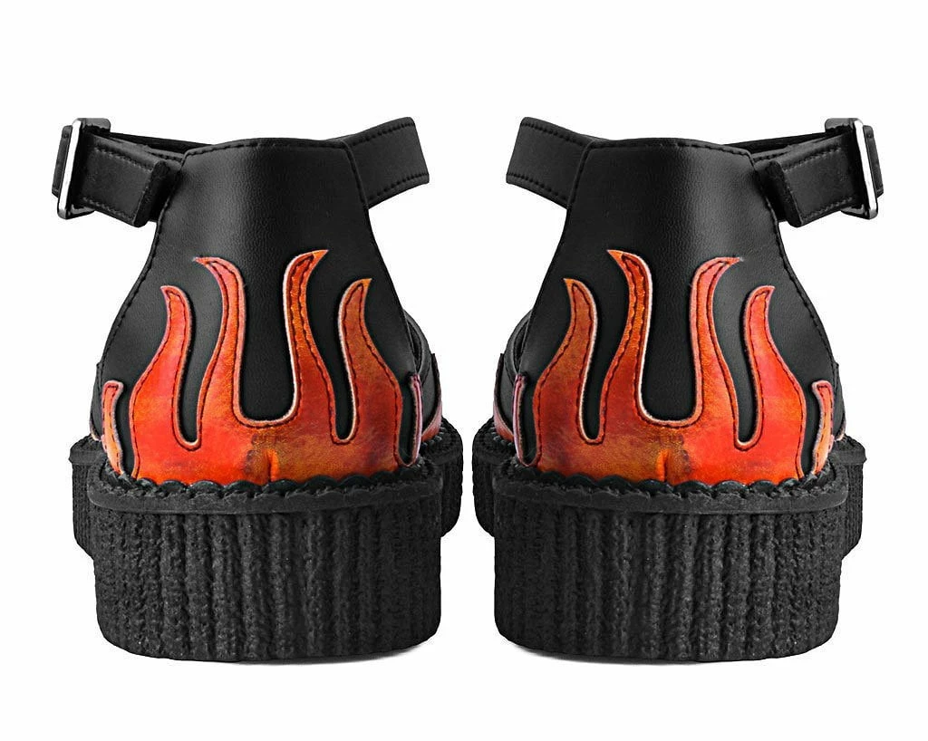 Make a tough, glam statement with a flame upper detail that also lends easy-to-wear style thanks to its laid-back sandal silhouette. Made of our high quality TUKskin(tm) material- polishable synthetic faux leather that is both soft and breathable. Features a pointed-shaped toe and ankle strap closure for an adjustable fit. Sits on top of a low sole creeper platform that measures 1 1/4ā at the heel and 3/4ā in the front. *Due to the nature of the specialty technique used for the flame coloring no two shoes are exactly alike, flame coloring will vary from shoe to shoe even in pairs