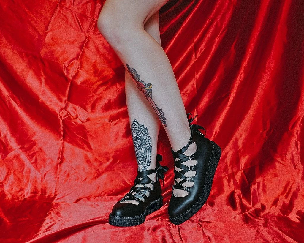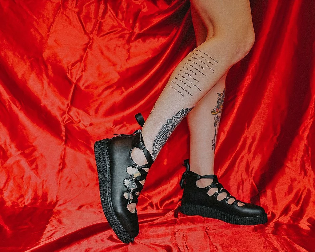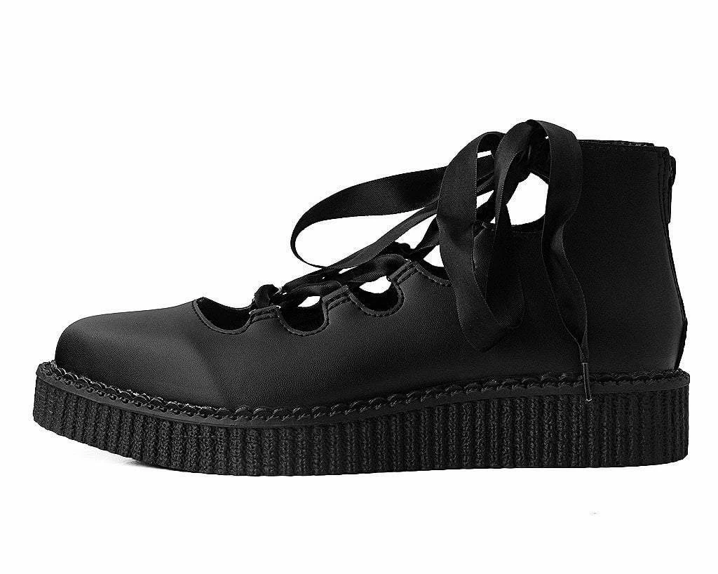 Shoes that make your daydreams come true. Made of our high quality TUKskin™ material — polishable synthetic faux leather that is both soft and breathable. Features a pointed-shaped toe and Ribbon twisted through loops for an adjustable fit. Sits on top of a low sole creeper platform that measures 1 ¼” at the heel and ¾” in the front. Has a back zipper for easy on/off wear and removable memory foam padding for added comfort.