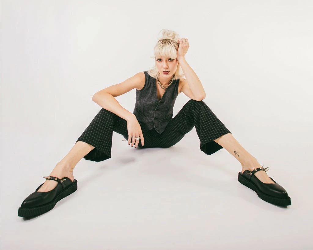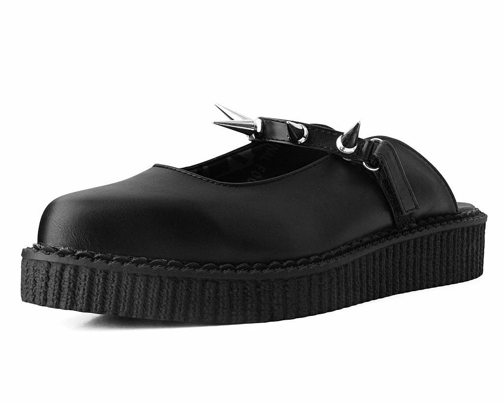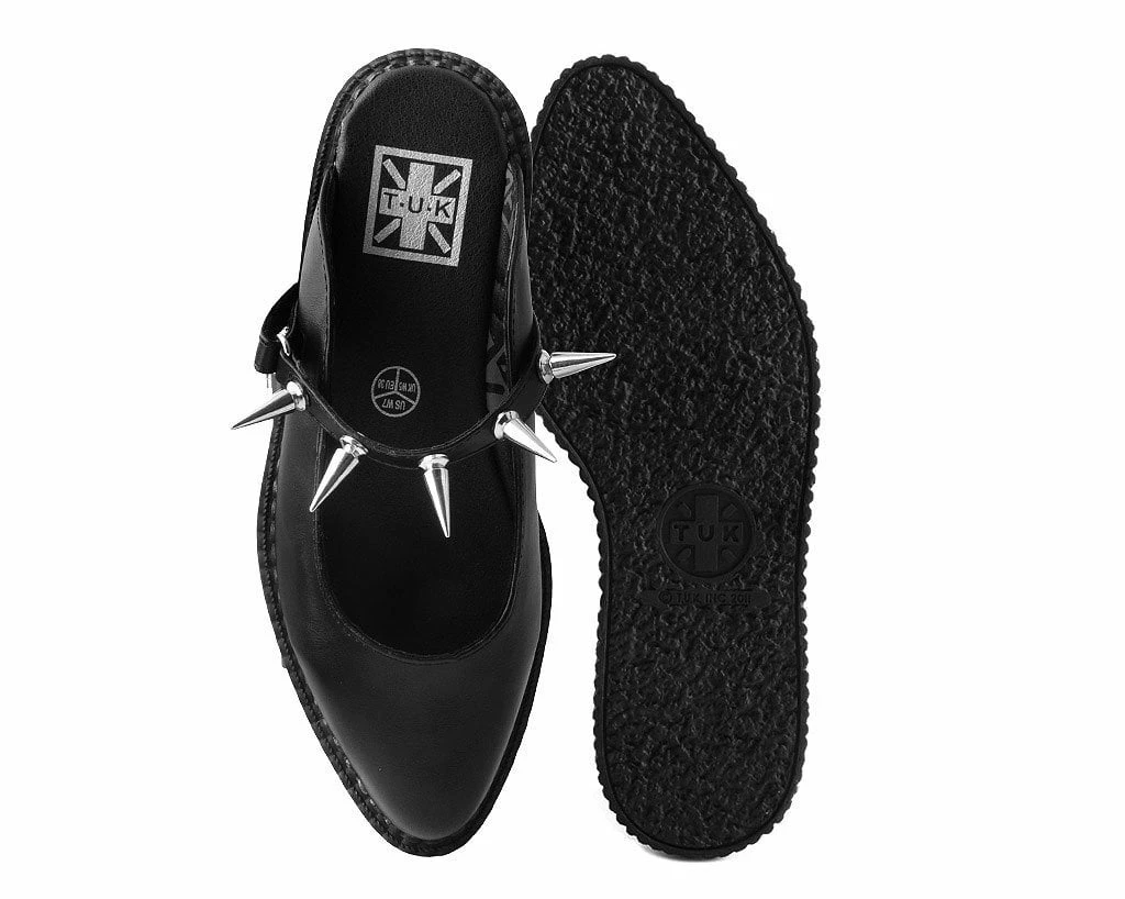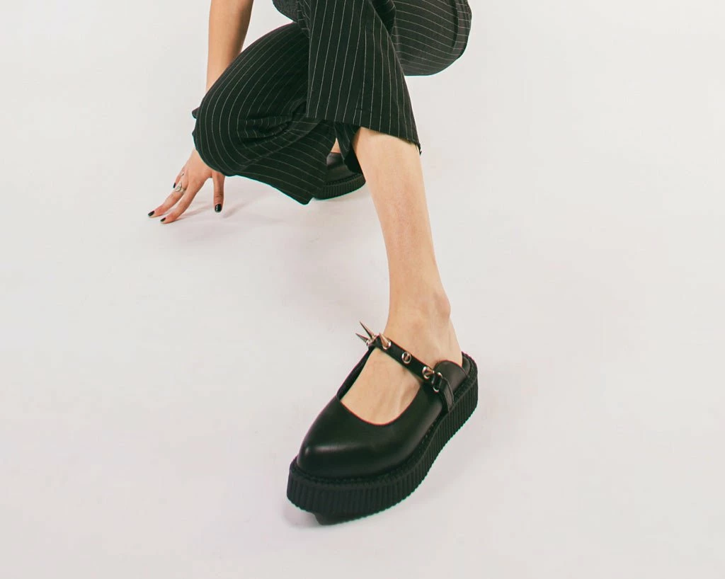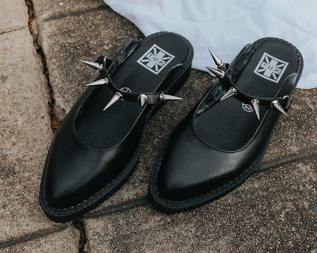 Wild from head to toe. Cute and dangerous mules with a strap lined with silver spikes that sits on the top of your foot. Made of our high quality TUKskin⢠material ā polishable synthetic faux leather that is both soft and breathable. Features a pointed-shaped toe. Sits on top of a low sole creeper platform that measures 1 ¼ā at the heel and ¾ā in the front. Has a back zipper for easy on/off wear and removable memory foam padding for added comfort.