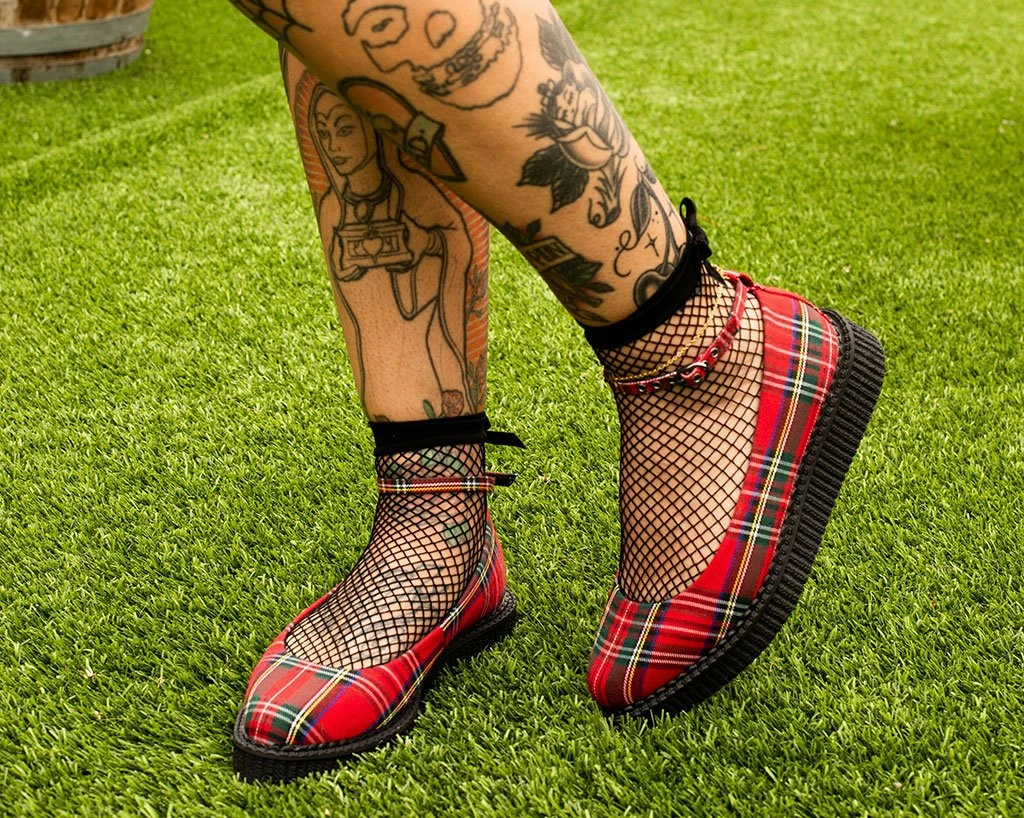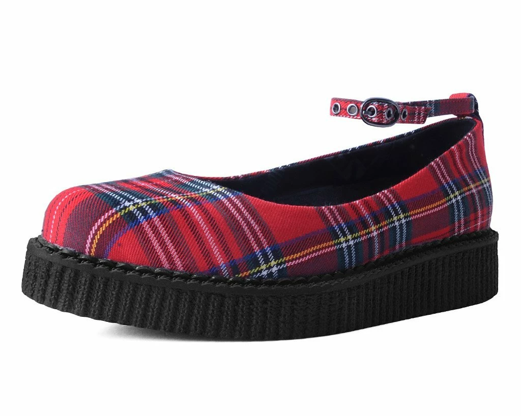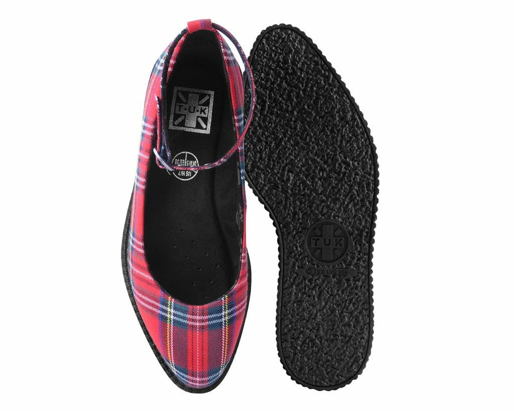 All over plaid. Features a vegan friendly red tartan microfiber upper with pointed toe construction and ankle strap closure for an adjustable fit. Sits on top of a low sole creeper platform that measures 1 ¼” at the heel and ¾” in the front. Has removable memory foam padding for added comfort.