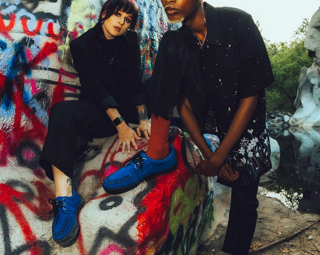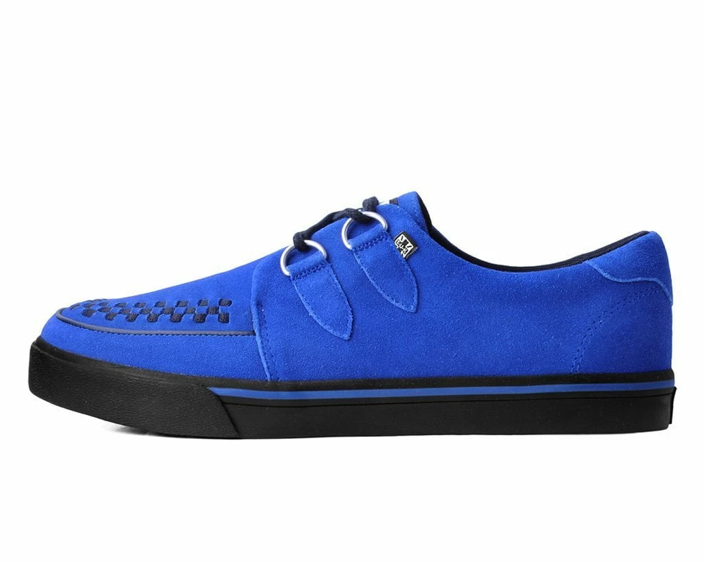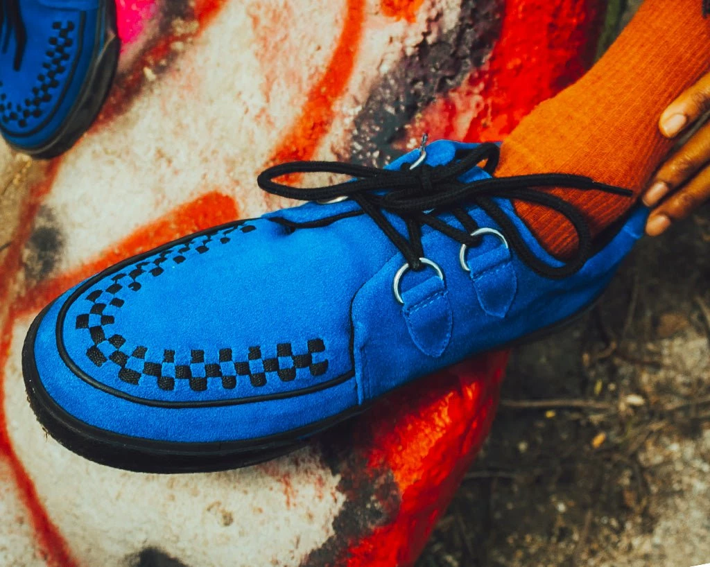Normal is boring! Get ready to hit the stage or the streets in these vulcanized sneakers that reimagines our former creeper sneaker silhouette with bold & modern twists. Features one of our crowd-pleasing upper styles of electric blue cow suede with classic D-rings & iconic interlace detailing along the front.