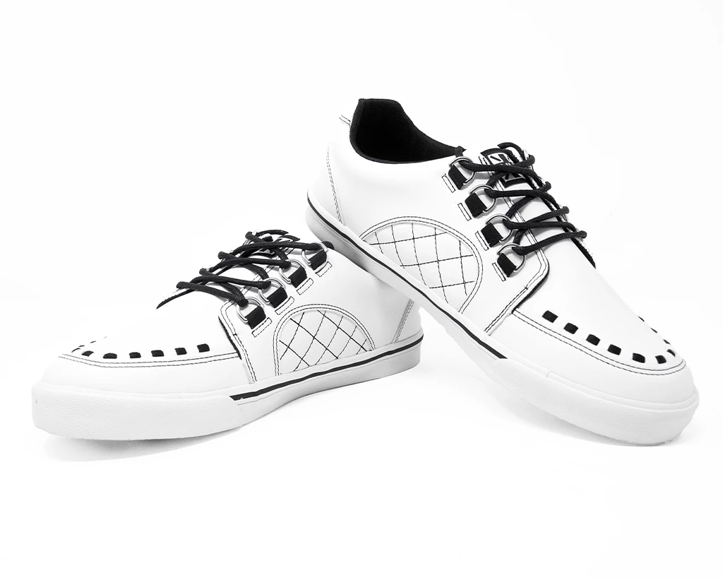 Your search for a durable and stylish sneaker is over. Our new quilted creeper sneakers are a new take on a classic favorite. Features everything we love: woven interlace, D-Rings, 3MM memory foam insole and that classic creeper sneaker feel. Features an all-white TUKskin™ upper and the iconic skull and bones along the sole. Our high quality TUKskin™ material — polishable synthetic faux leather that is both soft and breathable. Creep it real.