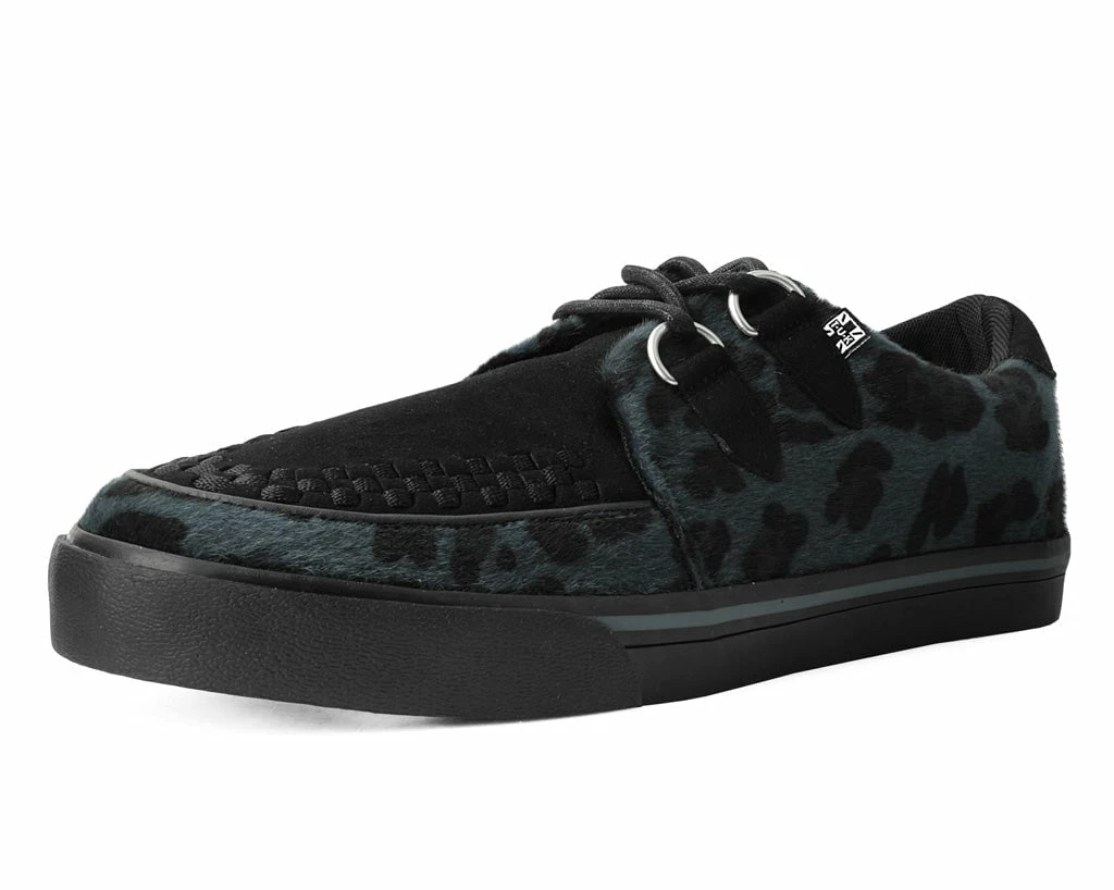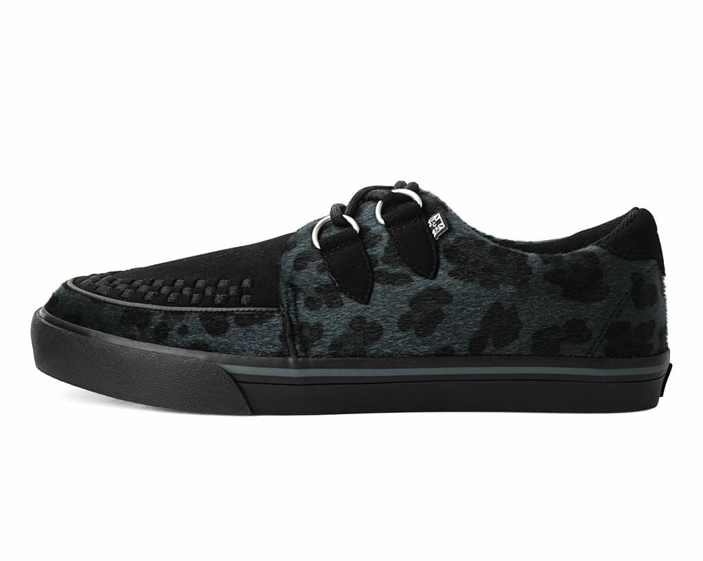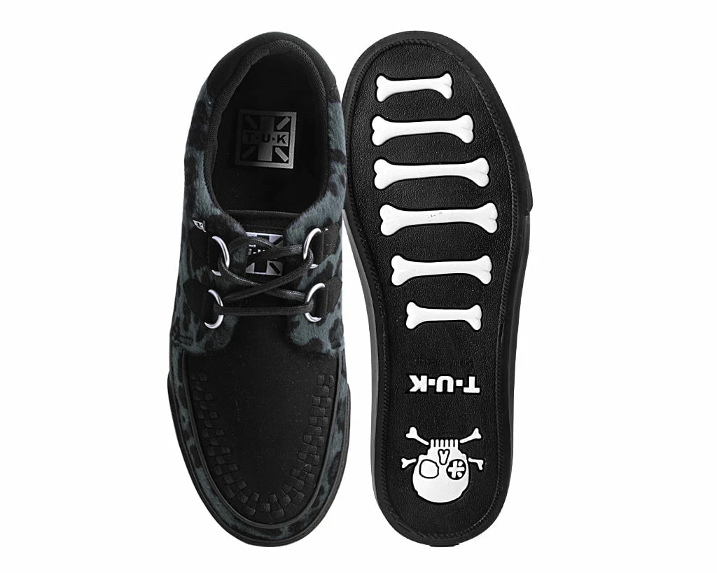 Normal is boring! Get ready to hit the stage or the streets in these vulcanized sneakers that reimagines our former creeper sneaker silhouette with bold & modern twists. Features one of our crowd-pleasing upper styles in a grey leopard hair with classic D-rings & iconic interlace detailing along the front.