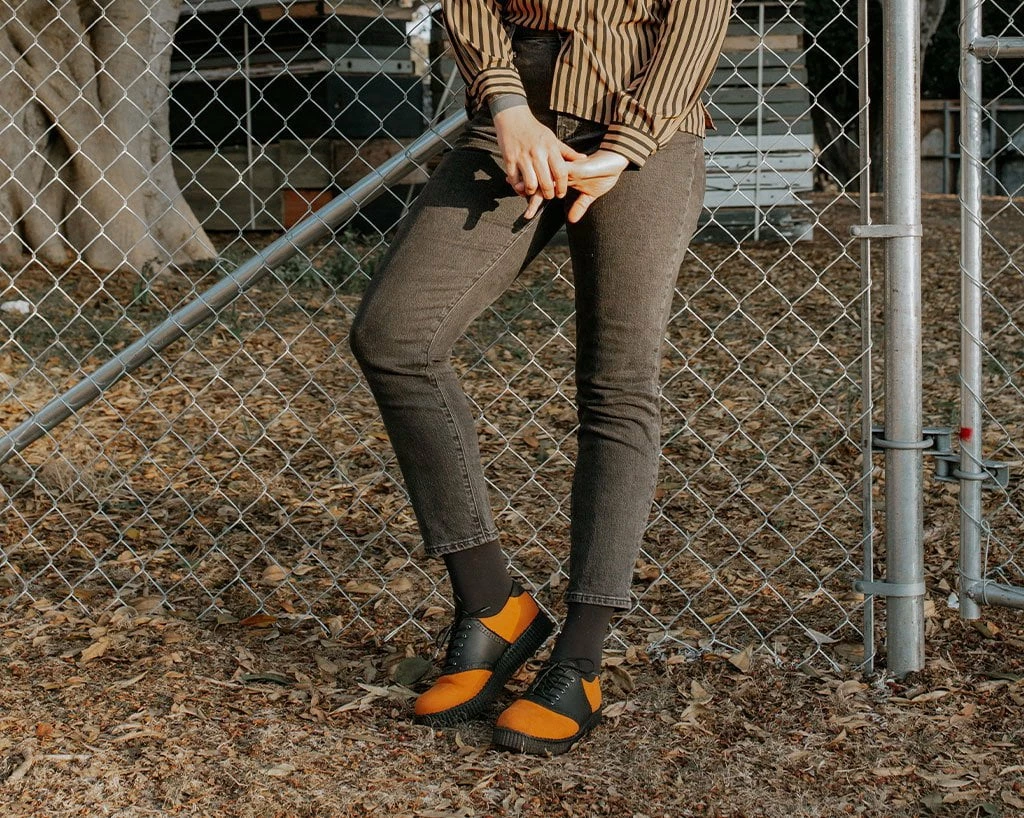 Give your wardrobe a color update with these orange saddle shoes. Features the vintage brogue detailing that will bring your casual outfits to the next level. A timeless creeper that sits on a new sleeker sole that is more lightweight and flexible than ever. Features a low platform height that is approximately 1 ¼” at the heel and ¾” in the front and is made of a mixture of EVA and rubber that contributes to the sole’s bendability. Has a two-tone upper made of our high quality TUKskin™ material — polishable synthetic faux leather that is both soft and breathable. Comes with removable memory foam insoles for added comfort.