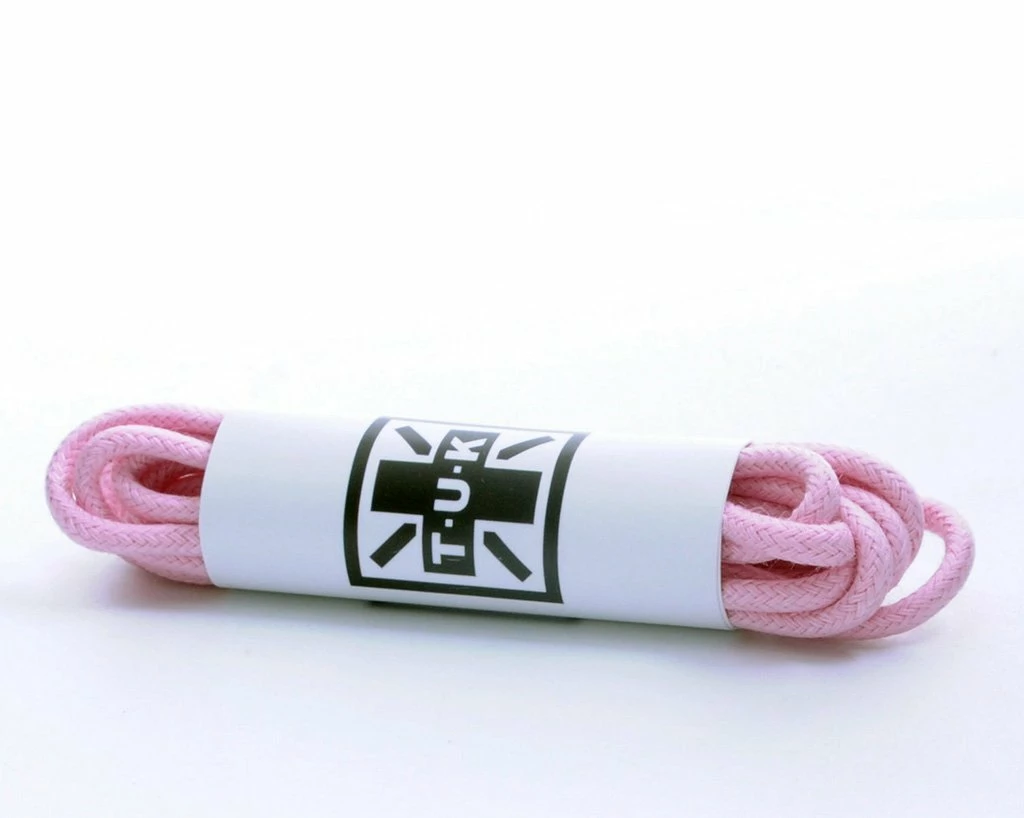Lace it up your way! Customize your footwear with these waxed cotton light pink round shoe laces that measures 75 cm long and 4mm wide. These laces are the ideal length for two D-ring eyelet creepers & D-ring VLK creeper sneakers.