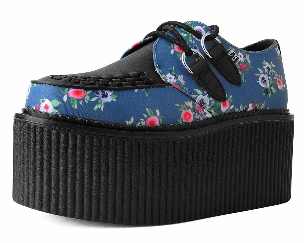Shoes to stomp on hearts with. Features a floral fabric upper on our lightweight VIVA stratocreeper sole that has a platform height approximately 3” at the heel and 2.5” in the front. Includes removable memory foam padding for extra comfort.