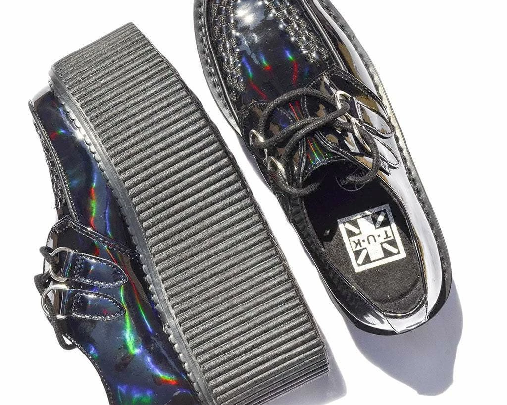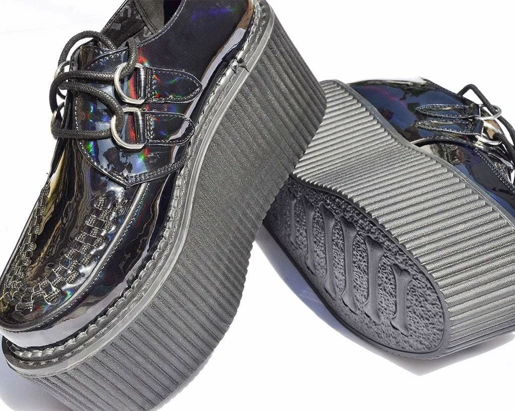 Shoes to stomp on hearts with. Features a vegan friendly and super eye-catching upper on our lightweight VIVA stratocreeper sole that has a platform height approximately 3” at the heel and 2.5” in the front. Includes removable memory foam padding for extra comfort.