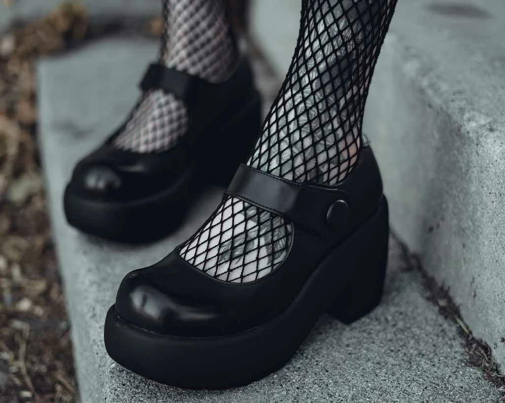All eyes on you. Features a black faux leather upper, a Velcro buckle closure and sits on the classic bubble heel. Stands at 2” in the front and 3.5” at the heel.