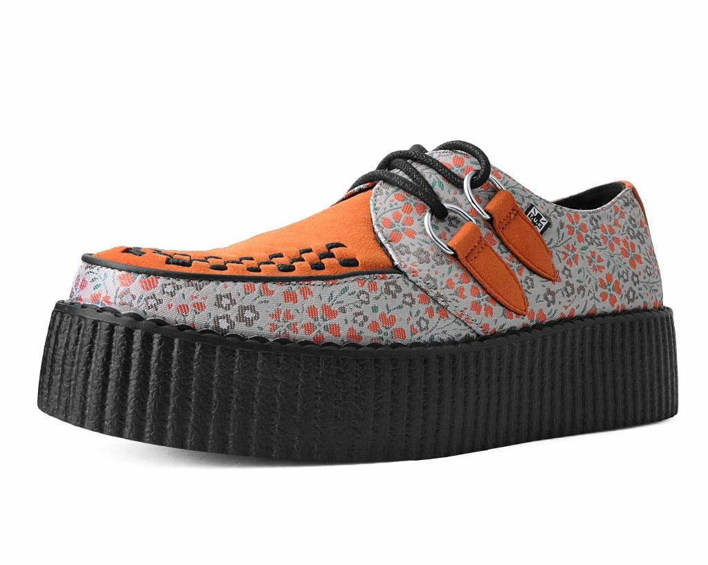 New shoes in bloom. Our lightweight Viva mondo sole is approximately 1 3/4” at the heel and 1 1/4” in the front. Has removable memory foam insoles for added comfort. Features microfiber on the vamp and a floral fabric upper. These round toe creepers have silver metal D-rings and features our patented T.U.K. Skull n’ Bones creeper sole design.