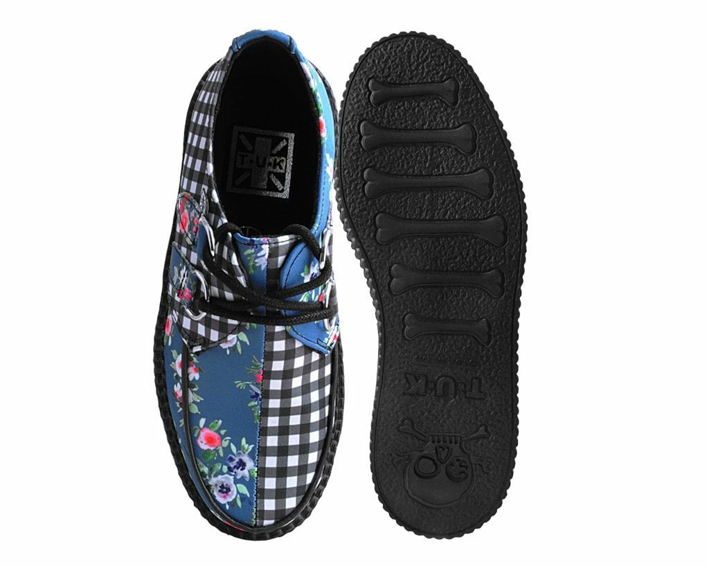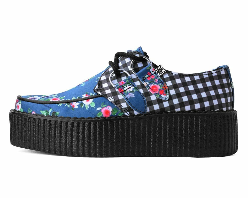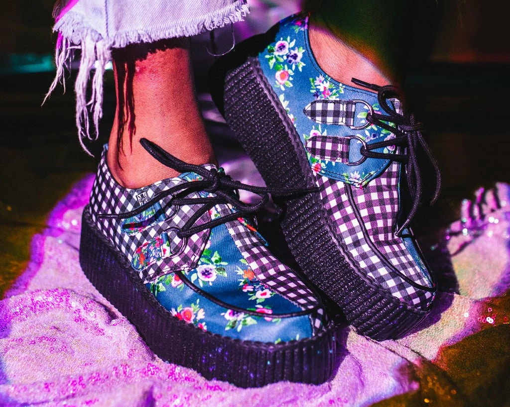 New shoes in bloom. Our lightweight Viva mondo sole is approximately 1 3/4β at the heel and 1 1/4β in the front. Has removable memory foam insoles for added comfort. Features a mixed pattern of floral and gingham fabric upper. These round toe creepers have silver metal D-rings and features our patented T.U.K. Skull n’ Bones creeper sole design.