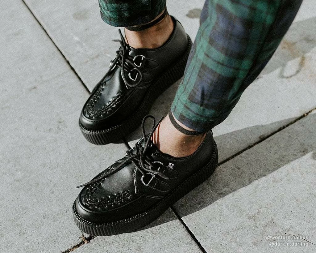Score a wardrobe win with these classic round toe creepers that offers our same bold, iconic style in a vegan alternative option. Has an all-black upper made of our high quality TUKskin⢠material ā polishable synthetic faux leather that is both soft and breathable. Features black woven interlace detailing, lace-up fastening, and our lightweight VIVA mondo sole that is approximately 1 ¾ā at the heel and 1 ¼ā in the front. Has removable memory foam padding for added comfort. Shoe can be easily cleaned with mild soap and water.