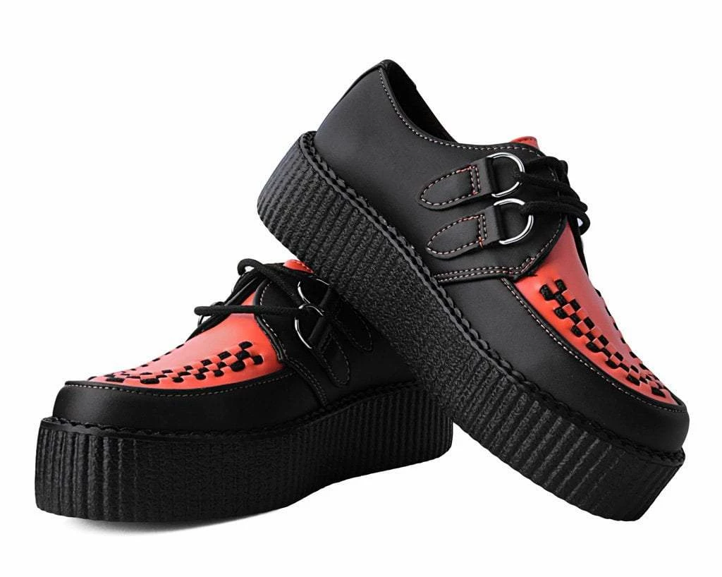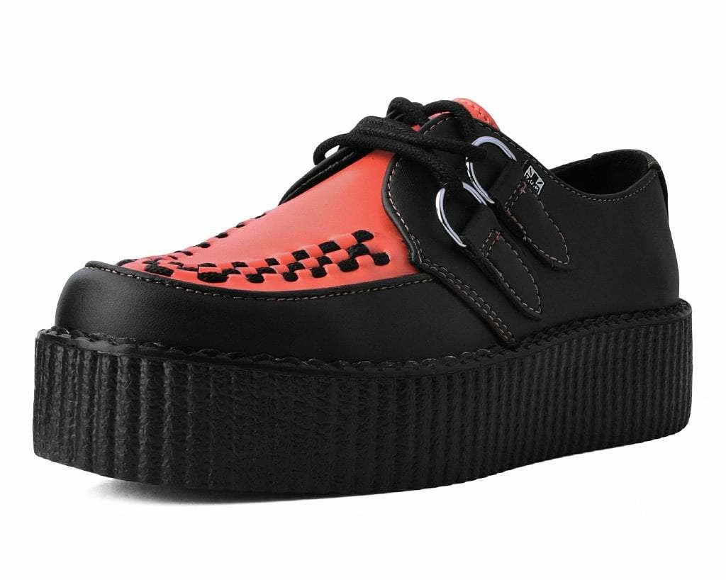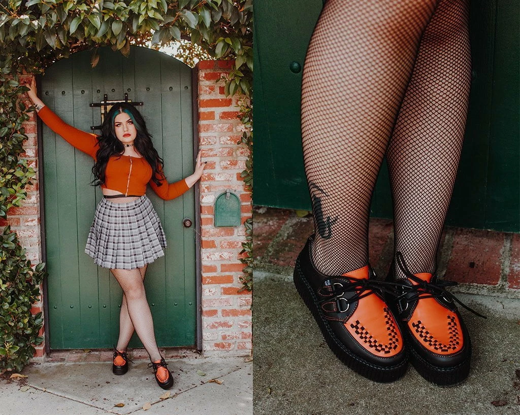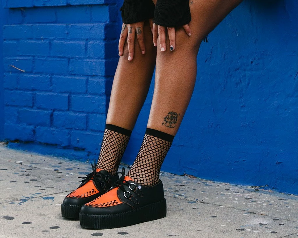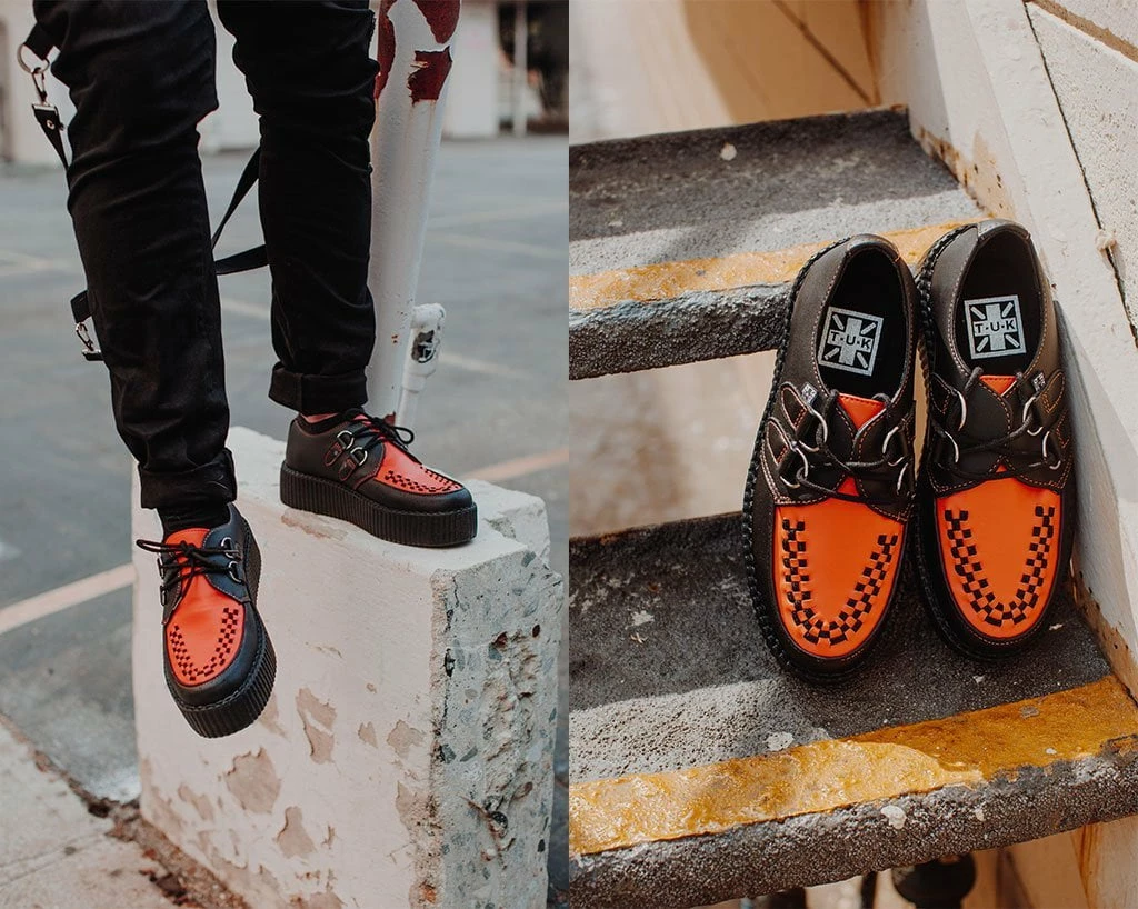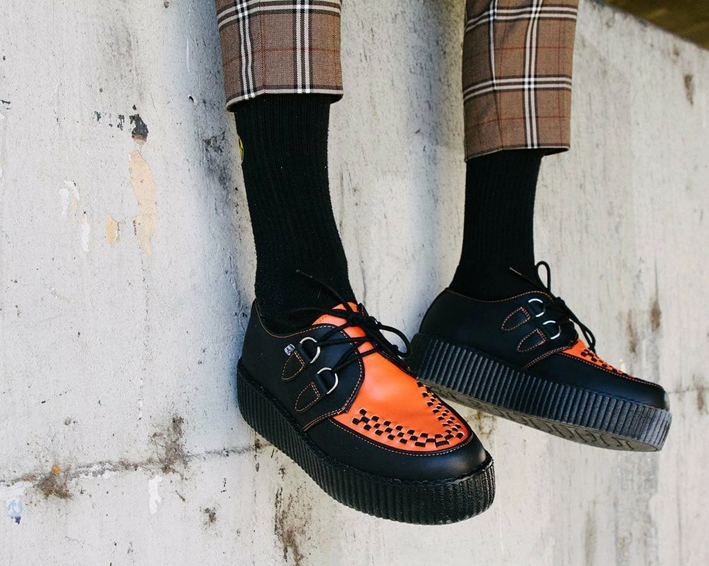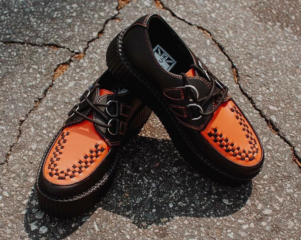 Set the standards with these classic round toe creepers that offers our same bold, iconic style in a vegan alternative option. Has a black upper contrasted with burnt orange on the vamp made of our high quality TUKskin⢠material ā polishable synthetic faux leather that is both soft and breathable. Features black woven interlace detailing, orange stitching, lace-up fastening, and our lightweight VIVA mondo sole that is approximately 1 ¾ā at the heel and 1 ¼ā in the front. Has removable memory foam padding for added comfort. Shoe can be easily cleaned with mild soap and water.