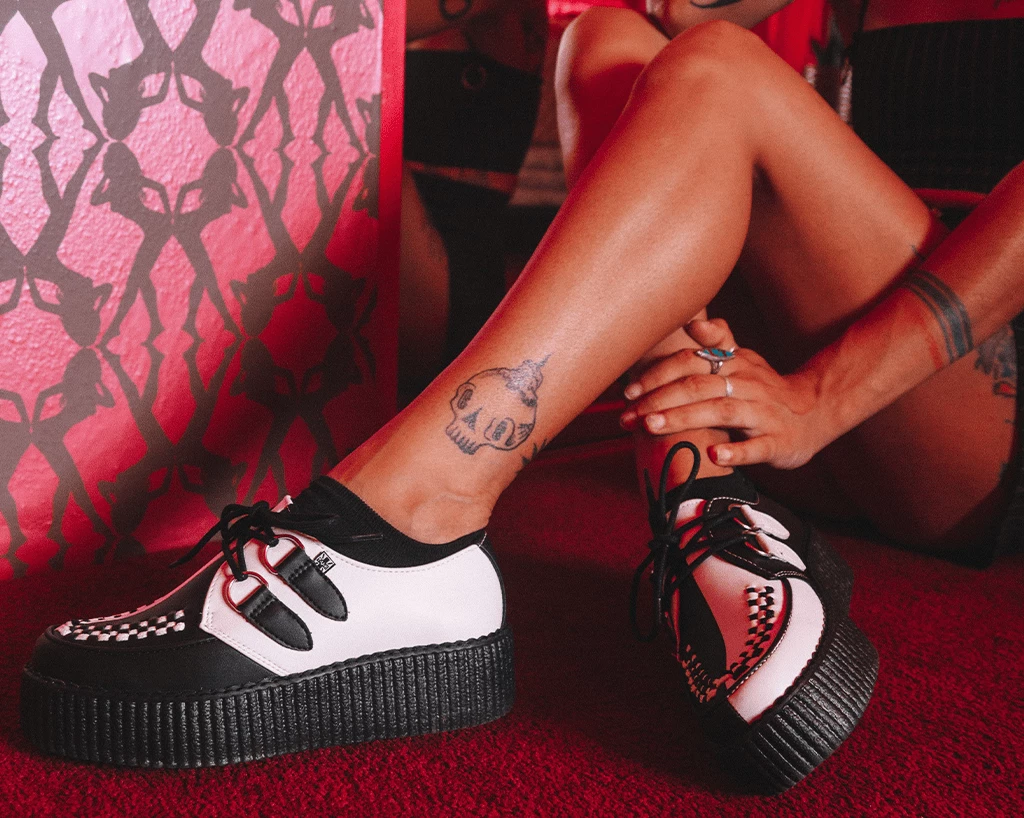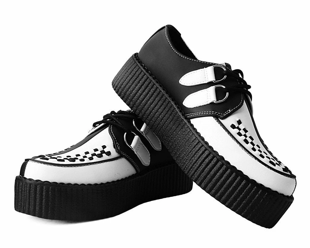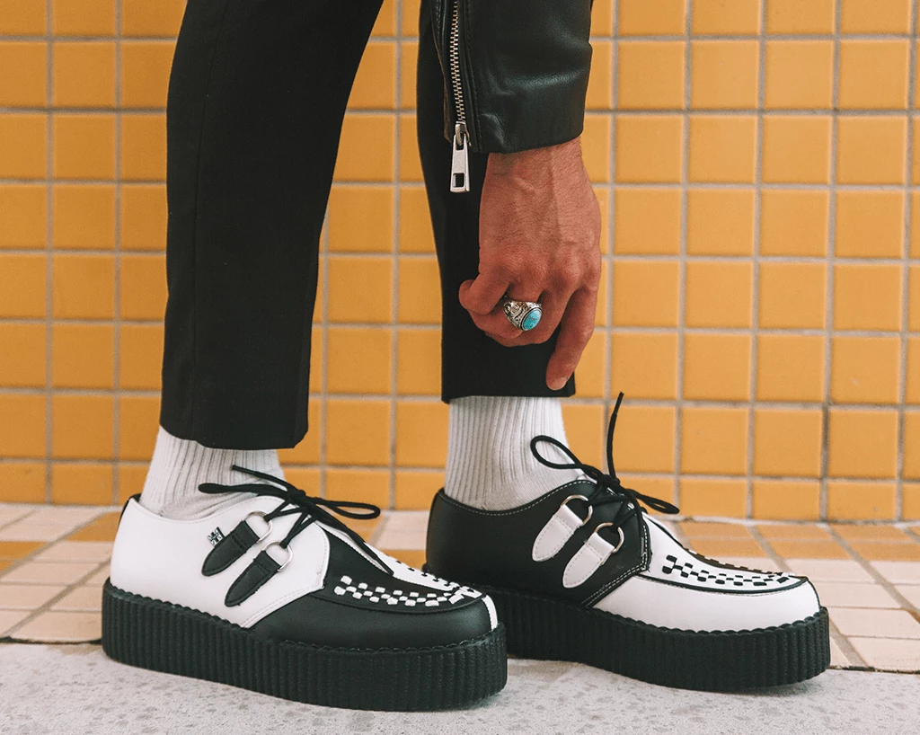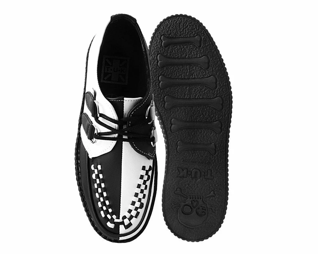 Lets talk two-tone. Has black & white two panel upper made of our high quality TUKskin™ material — polishable synthetic faux leather that is both soft and breathable. Features black woven interlace detailing, lace-up fastening, and our lightweight VIVA mondo sole that is approximately 1 ¾” at the heel and 1 ¼” in the front. Has removable memory foam padding for added comfort. Shoe can be easily cleaned with mild soap and water.